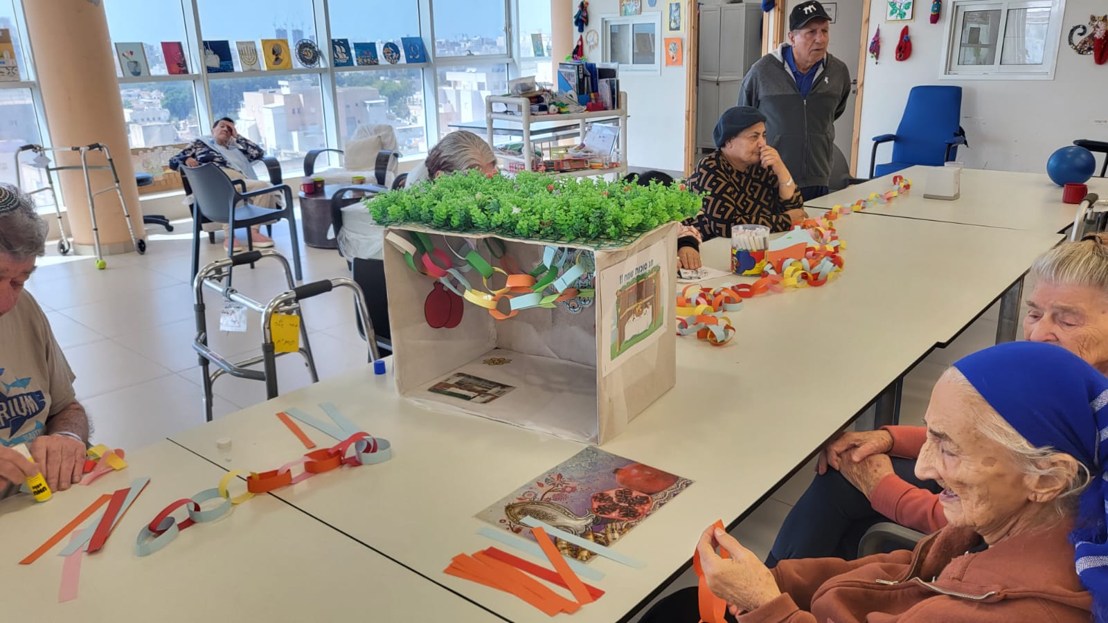 הדיירים לקחו חלק פעיל בבחירת הקישוטים, בגזירה, בצביעה ובתלייה, בליווי צוות המרכז ומתנדבים.
