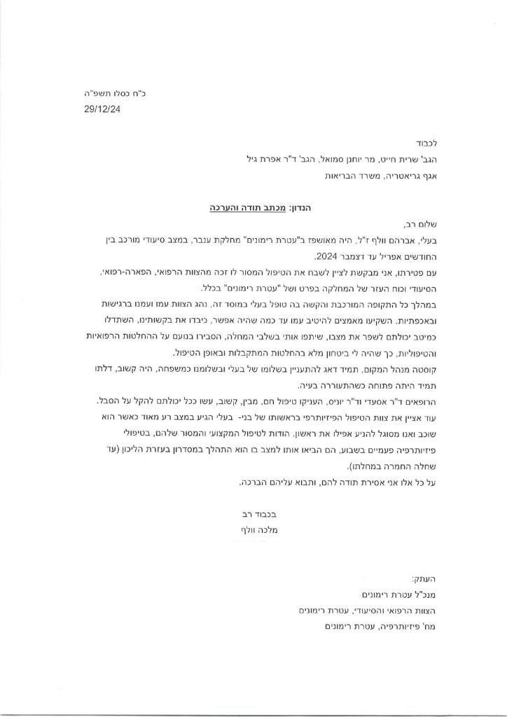 מכתב תודה לאחות תהילה, מוחמד וכל הצוות מקומה 5